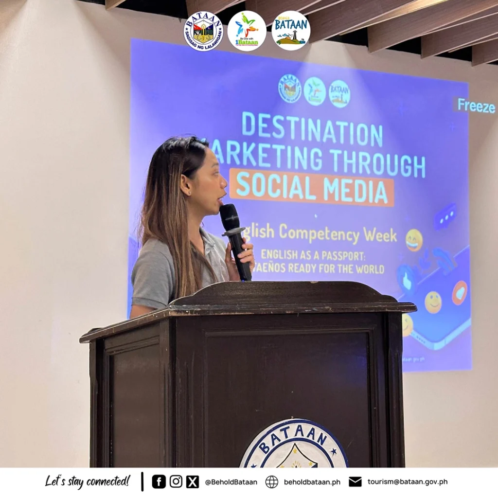 - Bataan Tourism Office Holds Seminar on Destination Marketing Through Social Mediaby adminAs part of the celebration of English Competency Week (ECW) 2025, the Provincial Government of Bataan, through the Provincial Tourism Office, conducted a seminar on “Destination Marketing Through Social Media” on September 17, 2025, at the Bataan Tourism Pavilion, City of Balanga.With the theme “English as a Passport: Bataeños Ready for the World,” the seminar… Read more: Bataan Tourism Office Holds Seminar on Destination Marketing Through Social Media