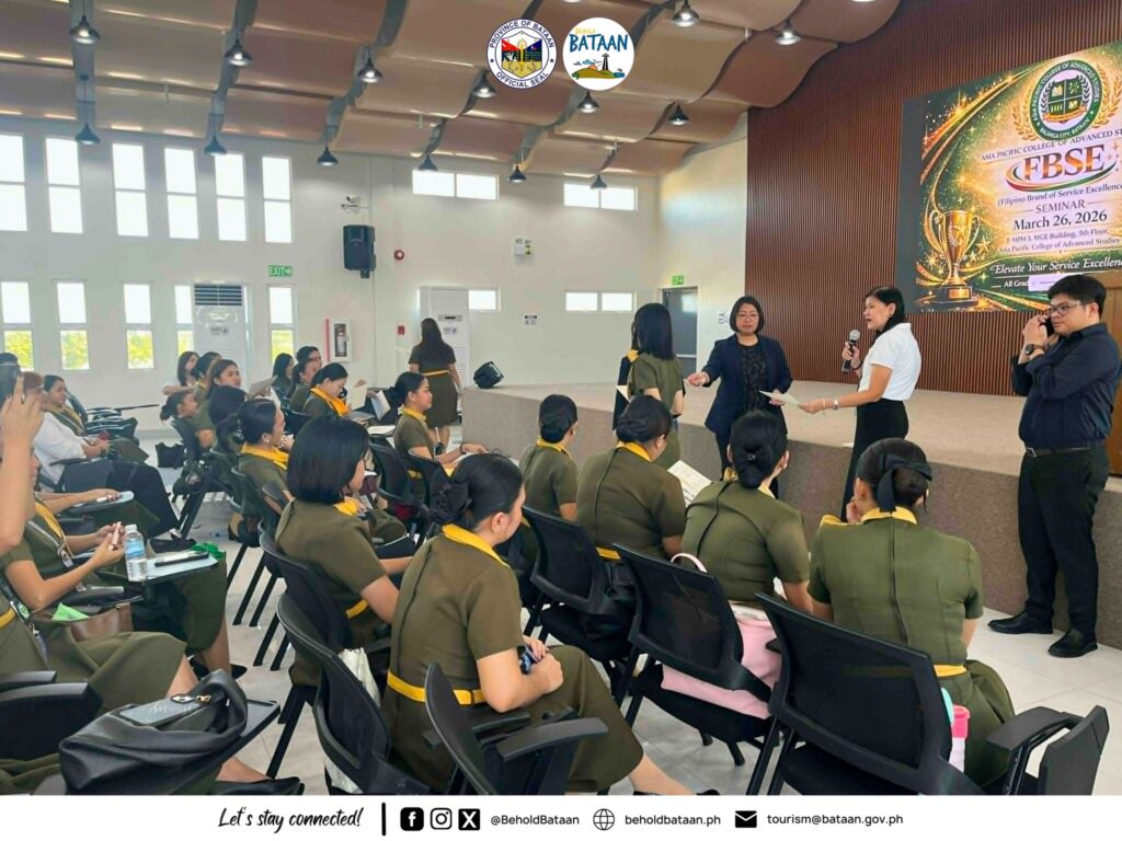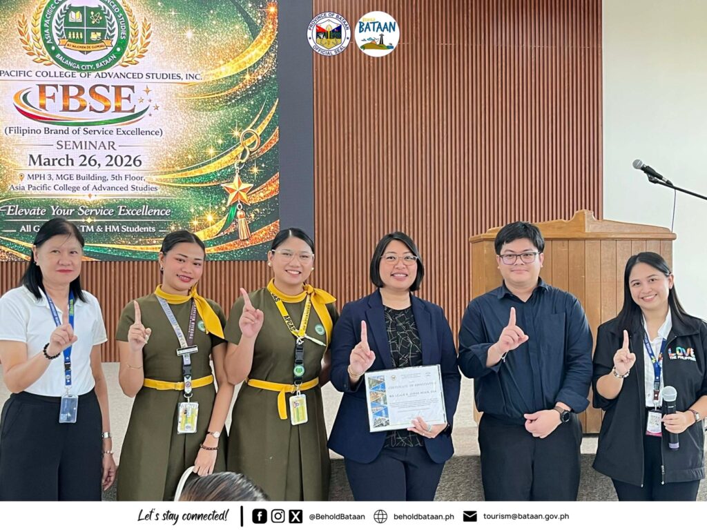 The Provincial Tourism Office, in partnership with the Department of Tourism (DOT), concluded the Filipino Brand of Service Excellence (FBSE) Seminar for 71 tourism students from Asia Pacific College of Advanced Studies (APCAS) on March 26, 2026. Guided by FBSE Trainer and Resource Speaker Leslie Jorge-Acain, DBA, the students strengthened their service excellence skills while